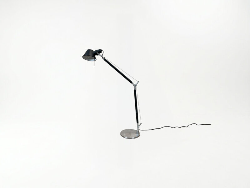 Deze Artemide Tolomeo bureaulamp zwart is een klassieker in modern verlichtingsdesign. Het betreft een verstelbare tafellamp met een volledig zwarte afwerking, bestaande uit een ronde, platte voet en een scharnierende arm. De constructie is gebaseerd op een veersysteem met spandraden, waardoor de lamp flexibel in verschillende posities te plaatsen is. De lampenkap, tevens in zwart, heeft een kegelvorm met een open onderzijde.