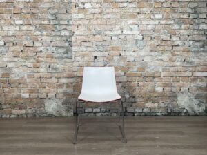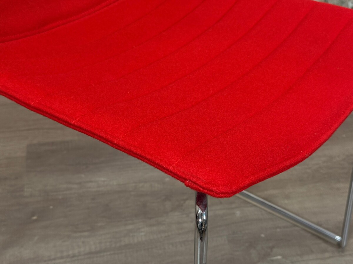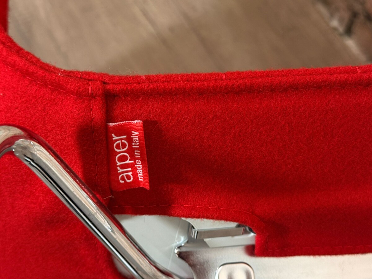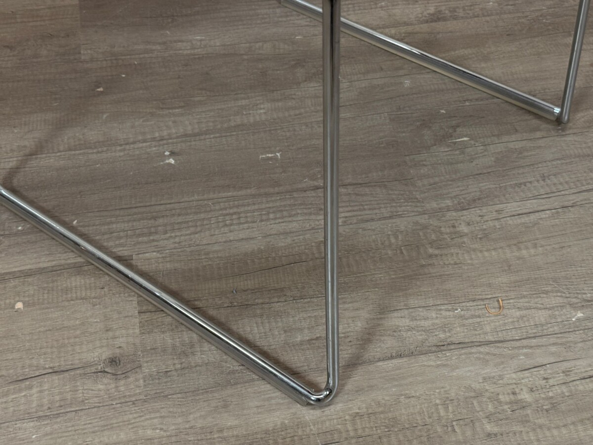 Het onderstel is een slank, chromen sledeframe waardoor de stoel er licht uitziet, maar toch heel stevig staat. De stoel is gemaakt van sterke materialen die tegen een stootje kunnen en die je heel makkelijk kunt afnemen met een doekje. Dit exemplaar ziet er nog heel netjes uit en is perfect voor wie houdt van Italiaans design met een vrolijke touch.