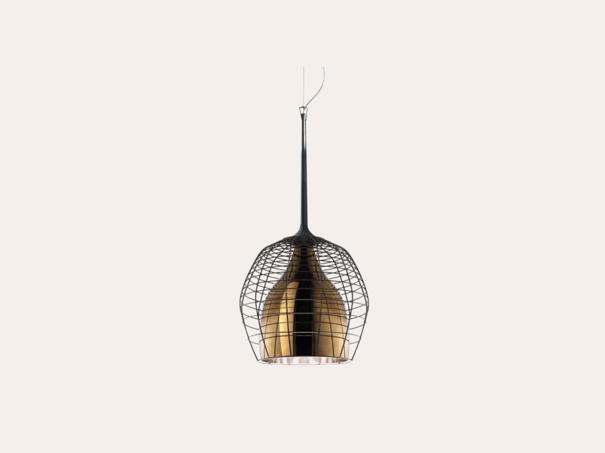 De Cage Piccola in brons is ontstaan uit een samenwerking tussen Diesel en Foscarini. Het ontwerp van deze design hanglamp is geïnspireerd door de lampen die gebruikt worden door mijnwerkers. De glazen lichtbron wordt omlijst door een roosterstructuur van staal en geeft half diffuus licht naar beneden gericht. Zeer geschikt voor boven de eet- en woonkamertafels of in een zakelijk interieur!