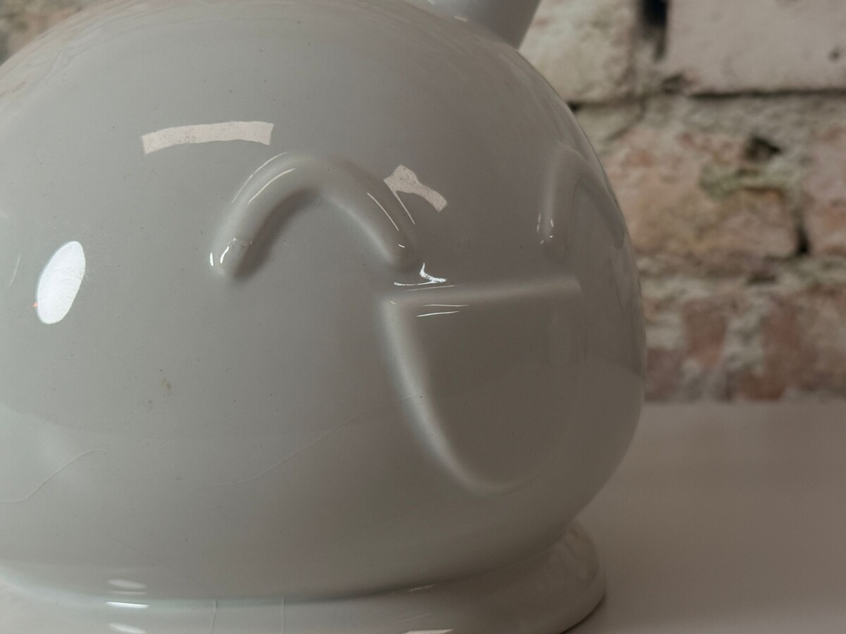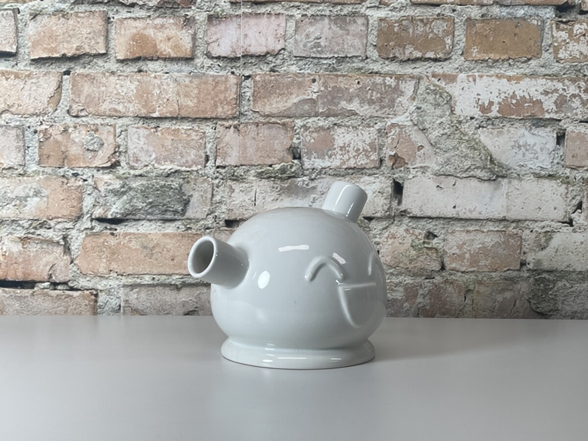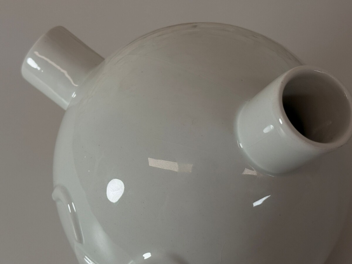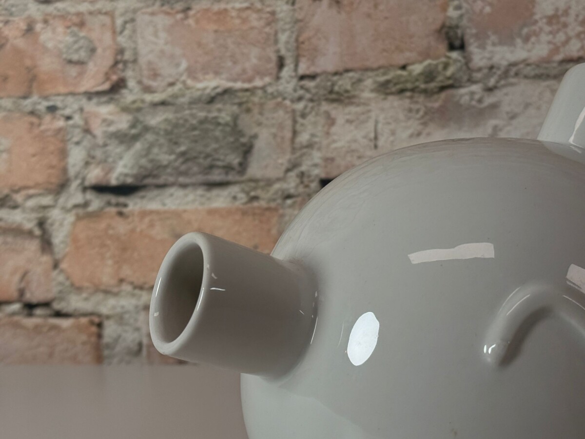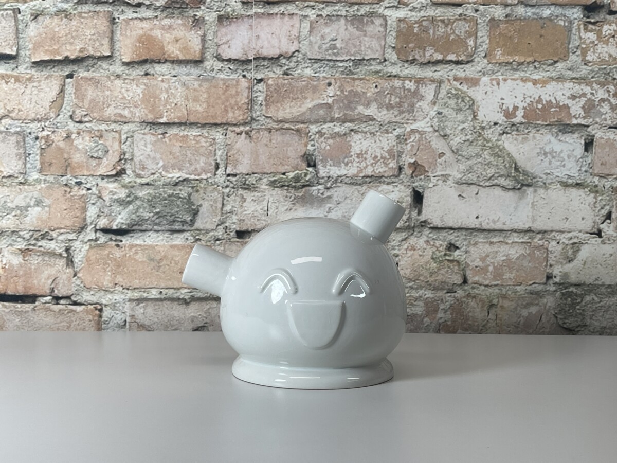 Het ontwerp is uitgevoerd in strak wit geglazuurd keramiek en is voorzien van de kenmerkende, vrolijke smileys die Frank Willems’ werk zo herkenbaar maken. Het object heeft twee tuiten, wat een verrassend effect geeft wanneer je er bijvoorbeeld subtiele droogbloemen in schikt. Het is een item dat direct een gesprek op gang brengt en een glimlach op ieders gezicht tovert. Deze Frank Willems Ooo verkeert in een uitstekende staat en is een absolute eyecatcher voor liefhebbers van modern design en kunst met een verhaal.