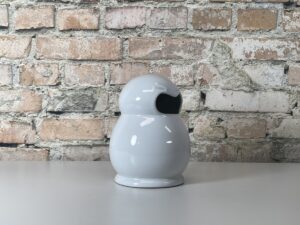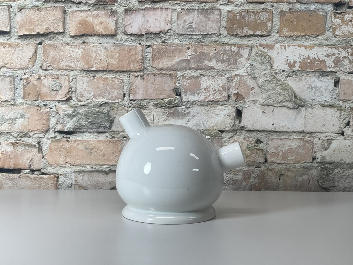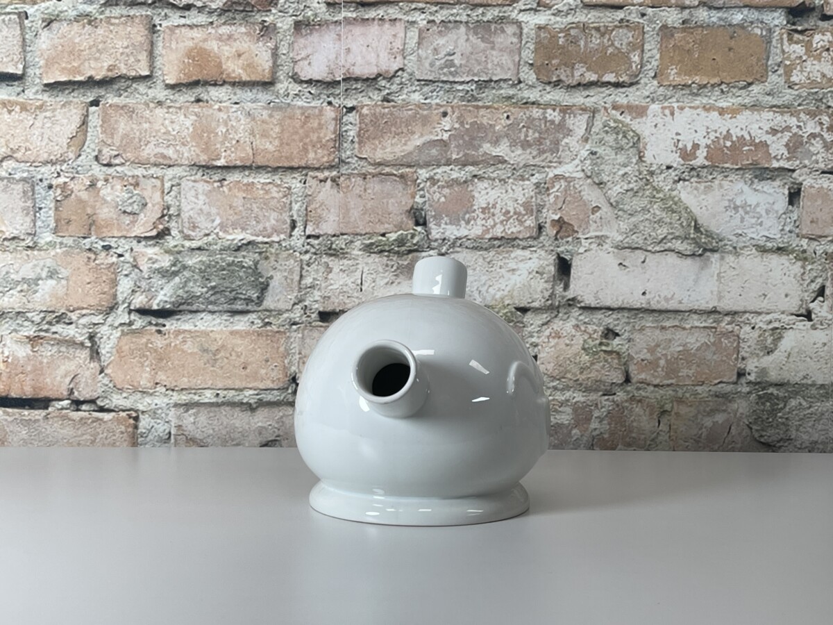 Dit unieke en speelse object is een prachtig voorbeeld van Nederlands design met een knipoog. Ontworpen door Frank Willems als onderdeel van zijn iconische ‘Speechless Collectie’, staat dit model bekend onder de naam “Ooo”. Hoewel het officieel is ontworpen als een ingenieus olie- en azijnstel, leent de organische vorm zich perfect om als unieke liggende vaas of decoratieve schenkkan te gebruiken.