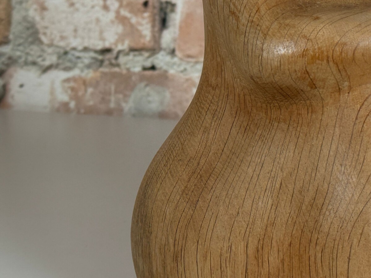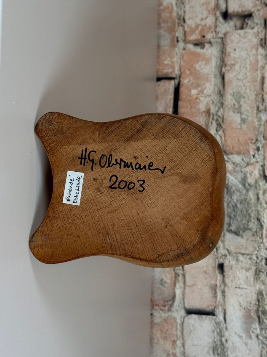 De Houtsculptuur H.G. Obermaier Ruhende is bijzonder omdat hij is gemaakt uit twee soorten hout. Voor de kop en de nek is een lichte houtsoort gebruikt, wat zorgt voor een gladde en verfijnde afwerking. Het lichaam is gesneden uit robuuster eikenhout, waar de nerven mooi zichtbaar zijn. Dit contrast geeft de sculptuur extra diepte. Het werk is op de onderzijde gesigneerd en gedateerd door H.G. Obermaier. Een waardevol unicum voor liefhebbers van kunst en design.