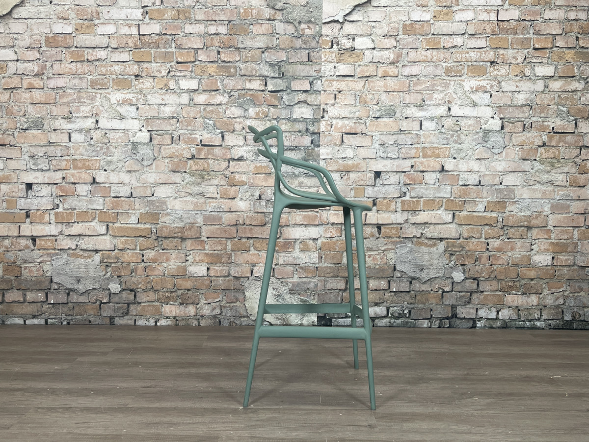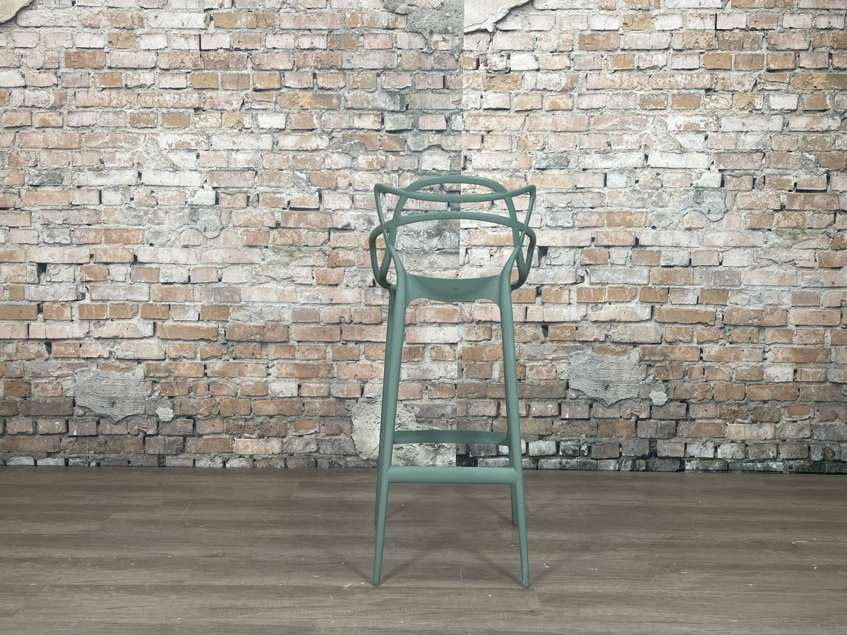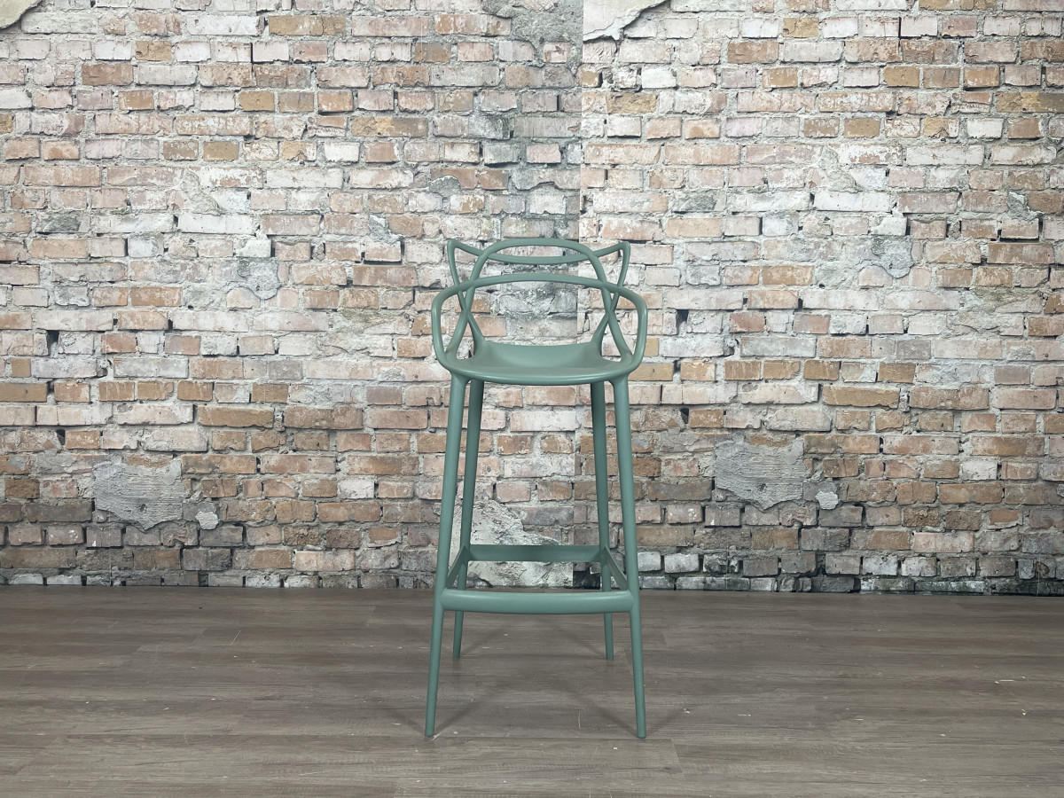 De Kartell Masters Barstool groen is een ontwerp van Philippe Starck en Eugeni Quitllet waarin de contouren van drie bekende designklassiekers samenkomen in een grafisch lijnenspel. De stoel is gemaakt van duurzaam kunststof, waardoor hij licht van gewicht, stapelbaar en geschikt is voor zowel binnen als buiten.