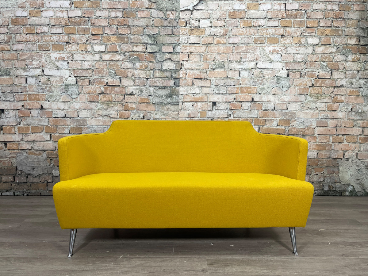 Een gele stoffen Moroso-bank brengt direct warmte en karakter in elke ruimte. Het opvallende ontwerp en de zachte textuur maken het een echte statement piece zonder overweldigend te zijn.
