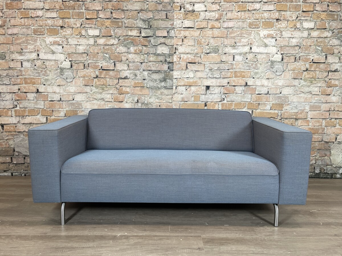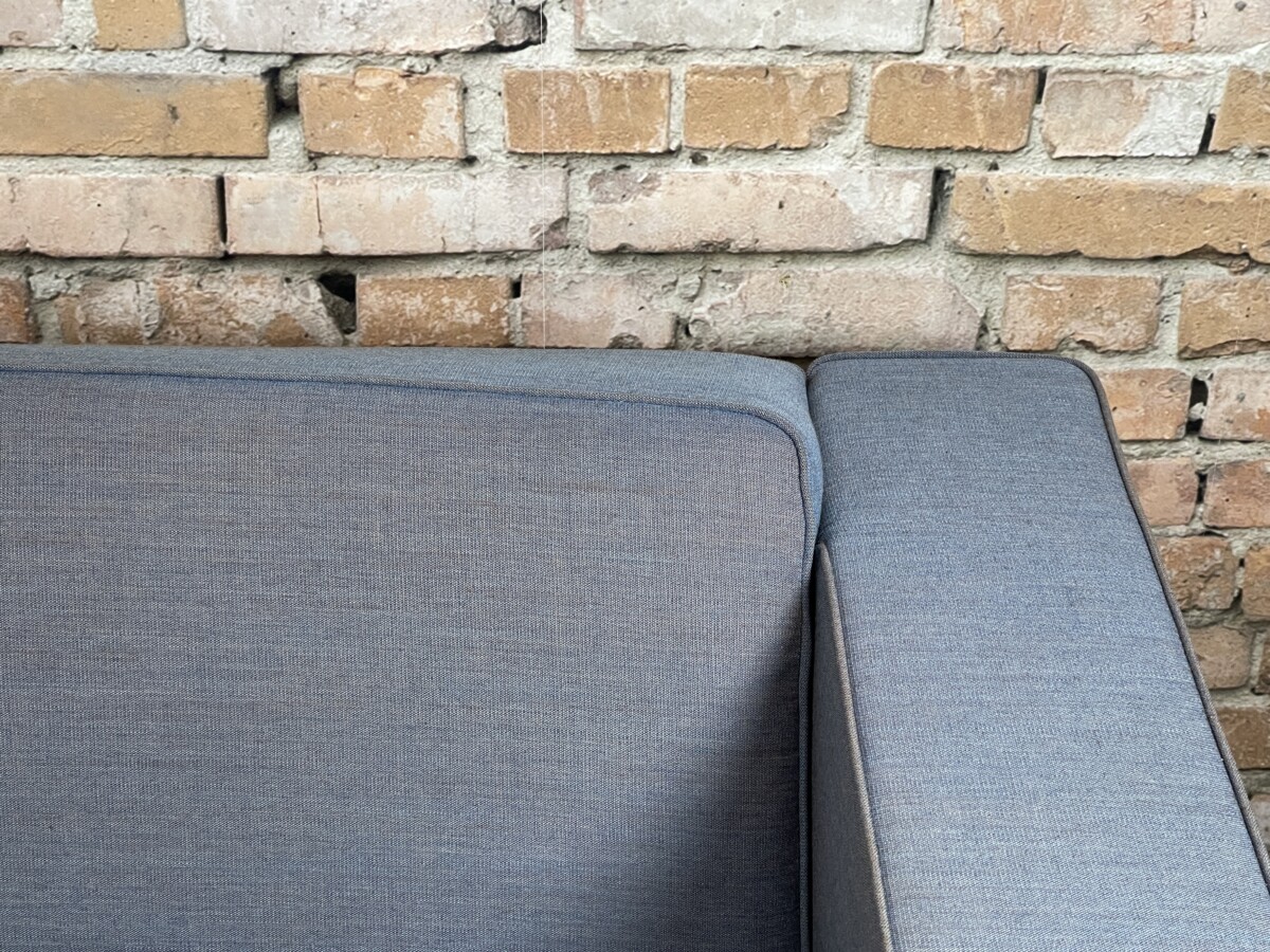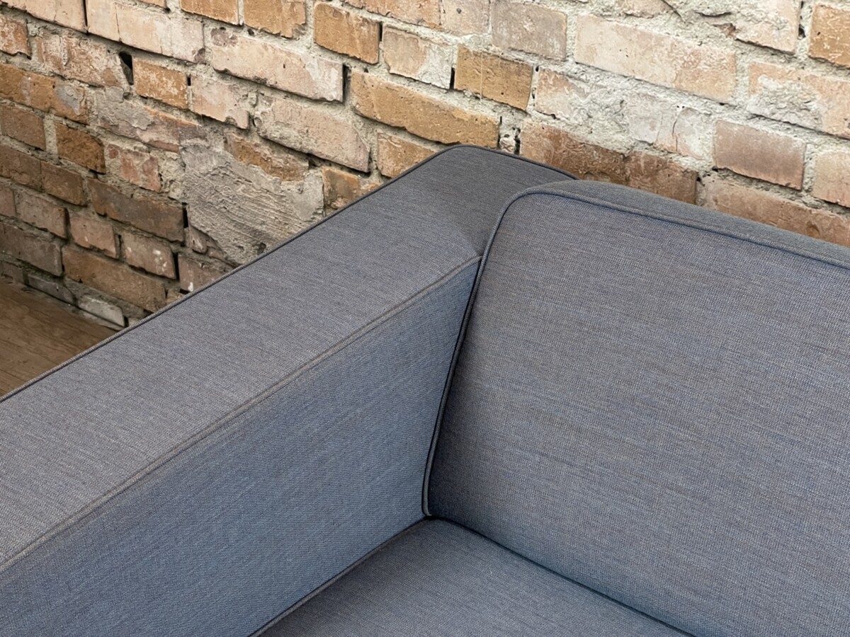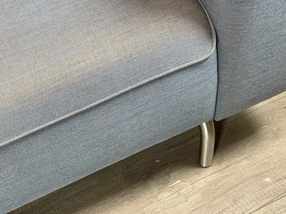 Mooie, moderne Palau bank met een tijdloos design. De strakke lijnen, brede armleuningen en metalen poten geven de bank een rustige en stijlvolle uitstraling. De Blauwe stof is neutraal en past makkelijk in verschillende interieurs.