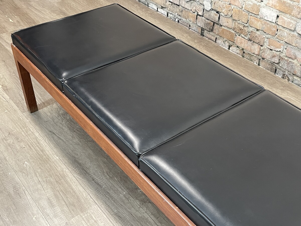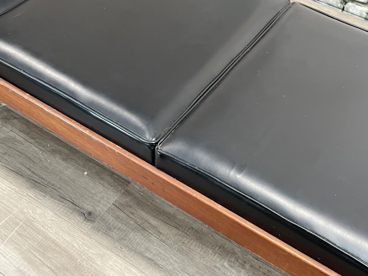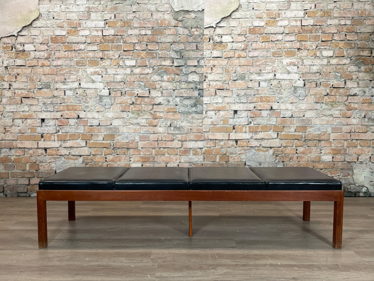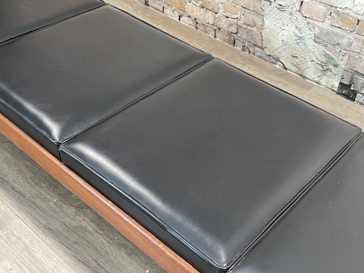 De zitting van deze Vintage Bank bestaat uit vier afzonderlijke, rechthoekige kussens in een zwarte kleur. De kussens zijn voorzien van een subtiele bies langs de randen voor een strakke afwerking. Het meubel bevindt zich in een originele, gebruikte staat; op de foto’s zijn diverse ouderdomssporen waarneembaar, waaronder slijtage aan de onderkant van de poten en lichte beschadigingen aan het oppervlak van het hout en de kussens.