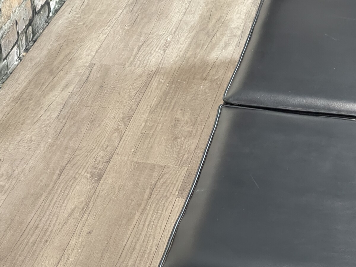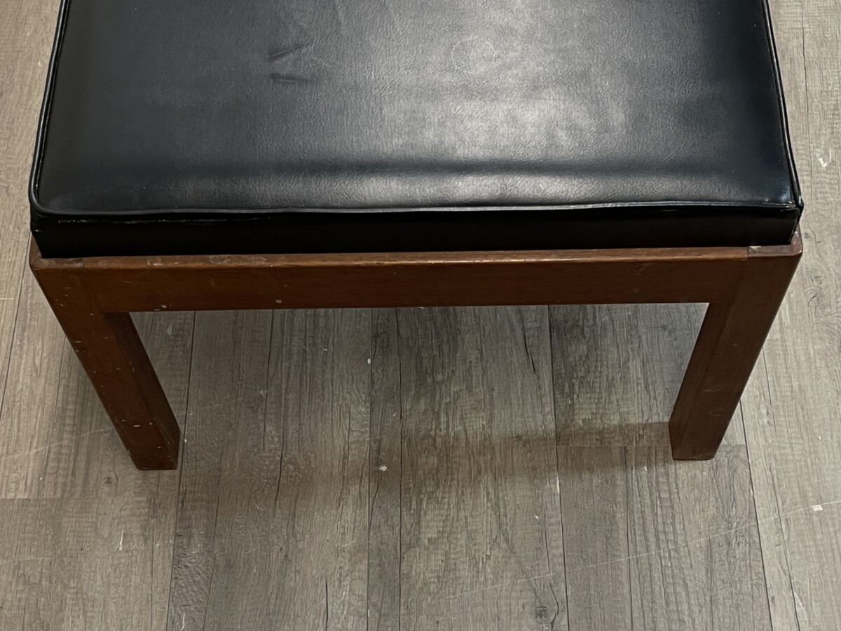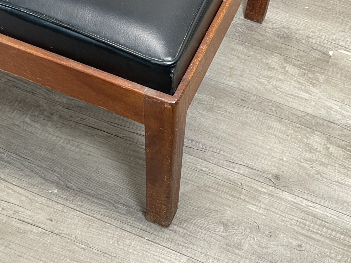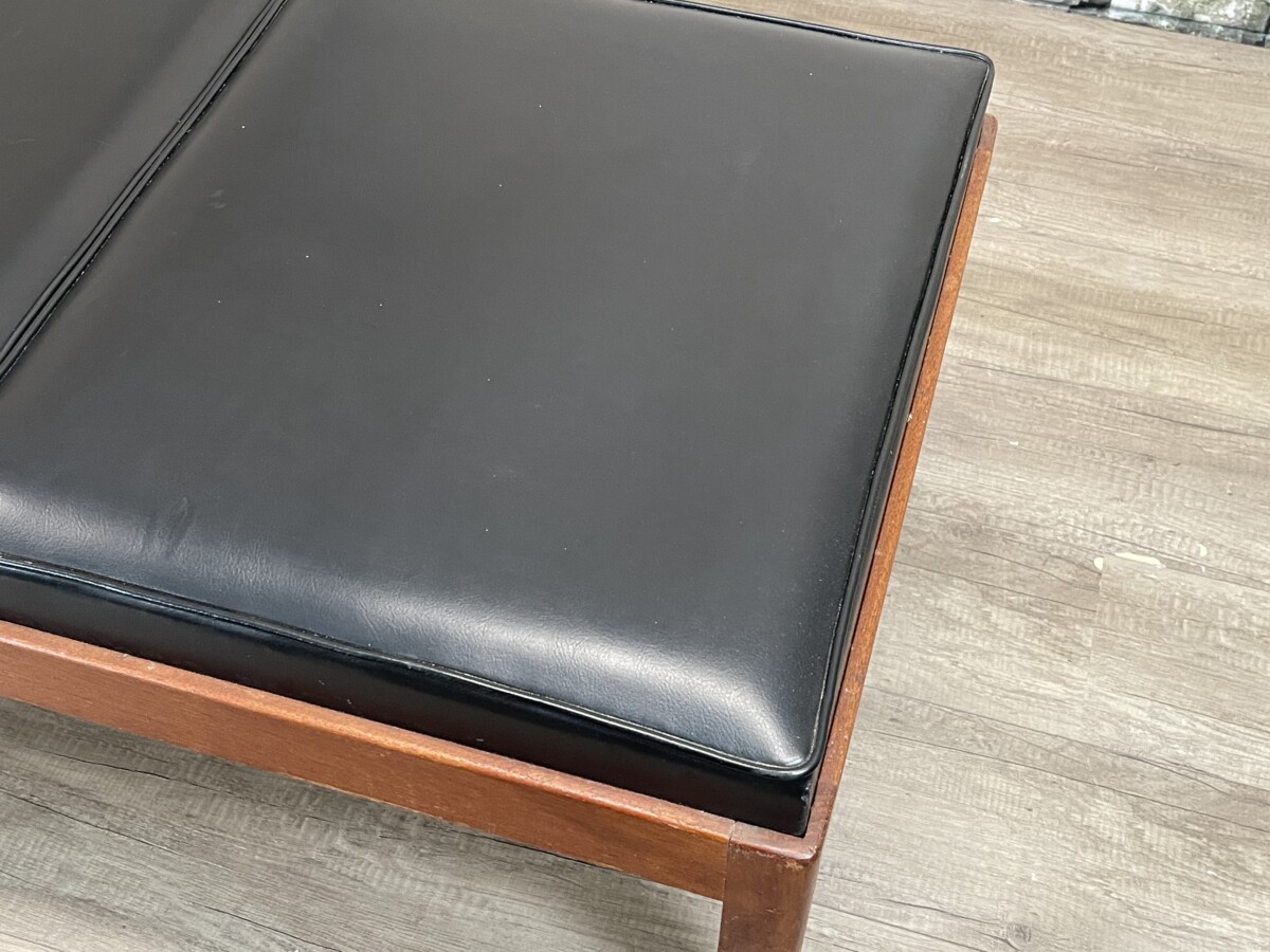 De zitting van deze Vintage Bank bestaat uit vier afzonderlijke, rechthoekige kussens in een zwarte kleur. De kussens zijn voorzien van een subtiele bies langs de randen voor een strakke afwerking. Het meubel bevindt zich in een originele, gebruikte staat; op de foto’s zijn diverse ouderdomssporen waarneembaar, waaronder slijtage aan de onderkant van de poten en lichte beschadigingen aan het oppervlak van het hout en de kussens.